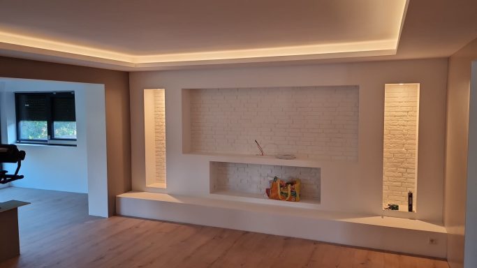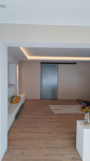 Es wurden alle Decken mit Gipskarton abgehangen, um die Installation von Deckenspots zu ermöglichen. Im Anschluss wurden die Decken und Wände gespachtelt und in der Wunschfarbe gestrichen.