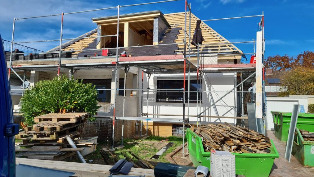 Der Dachstuhl wurde aufgenommen, eine Gaube eingebaut und die bestehende erweitert. Anschließend wurde energetische Dämmung verbaut und das Dach neu eingedeckt.