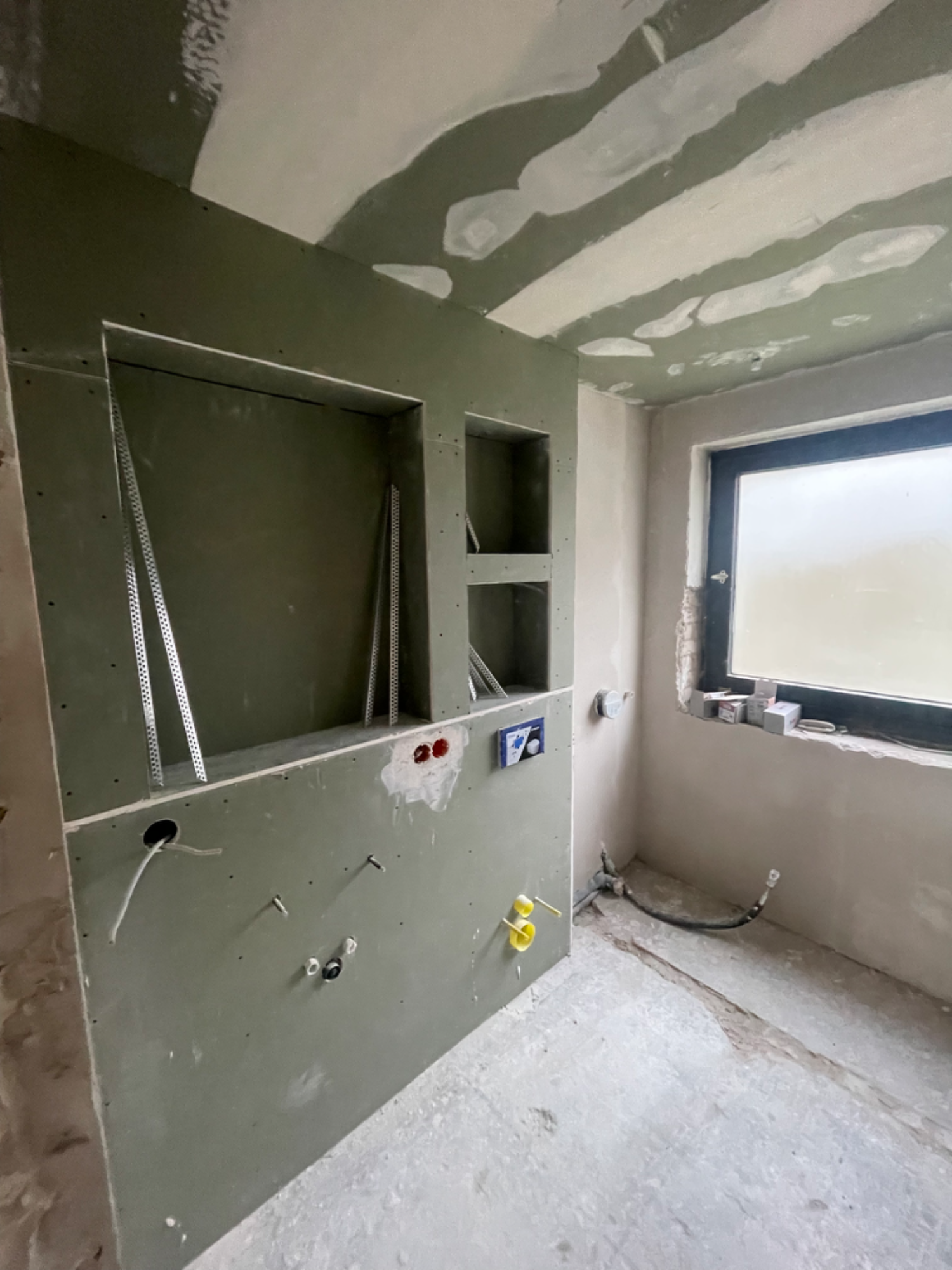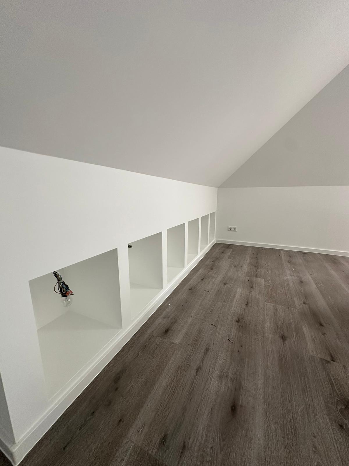 Es wurden alle Decken mit Gipskarton abgehangen, um die Installation von Deckenspots zu ermöglichen. Im Anschluss wurden die Decken und Wände gespachtelt und in der Wunschfarbe gestrichen.