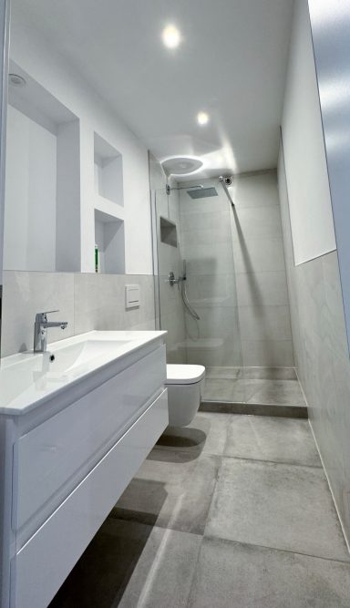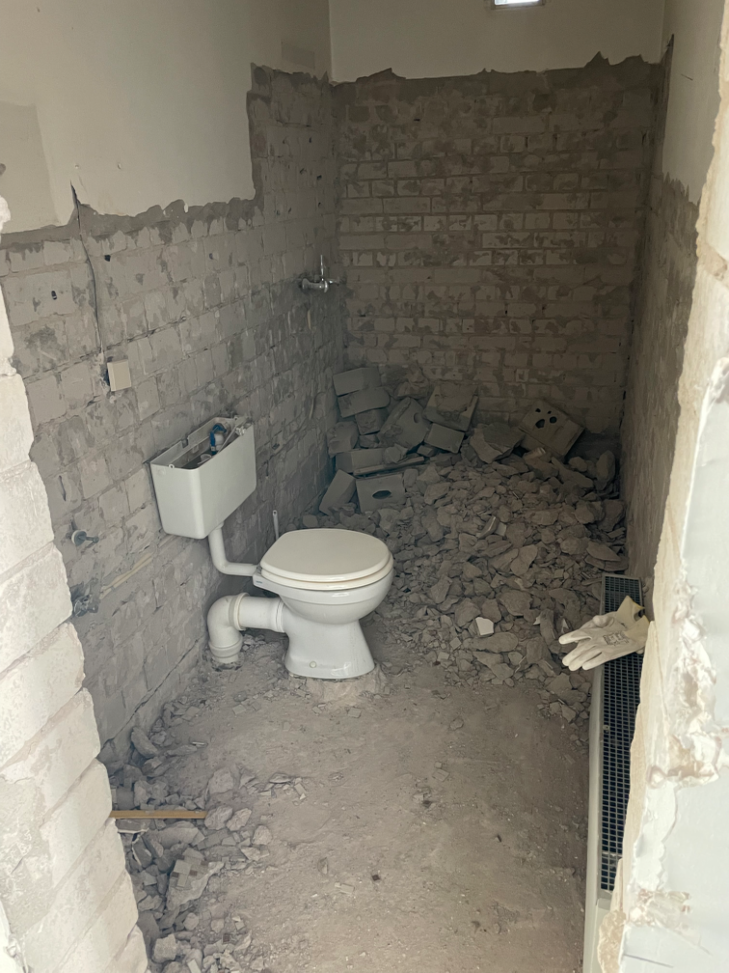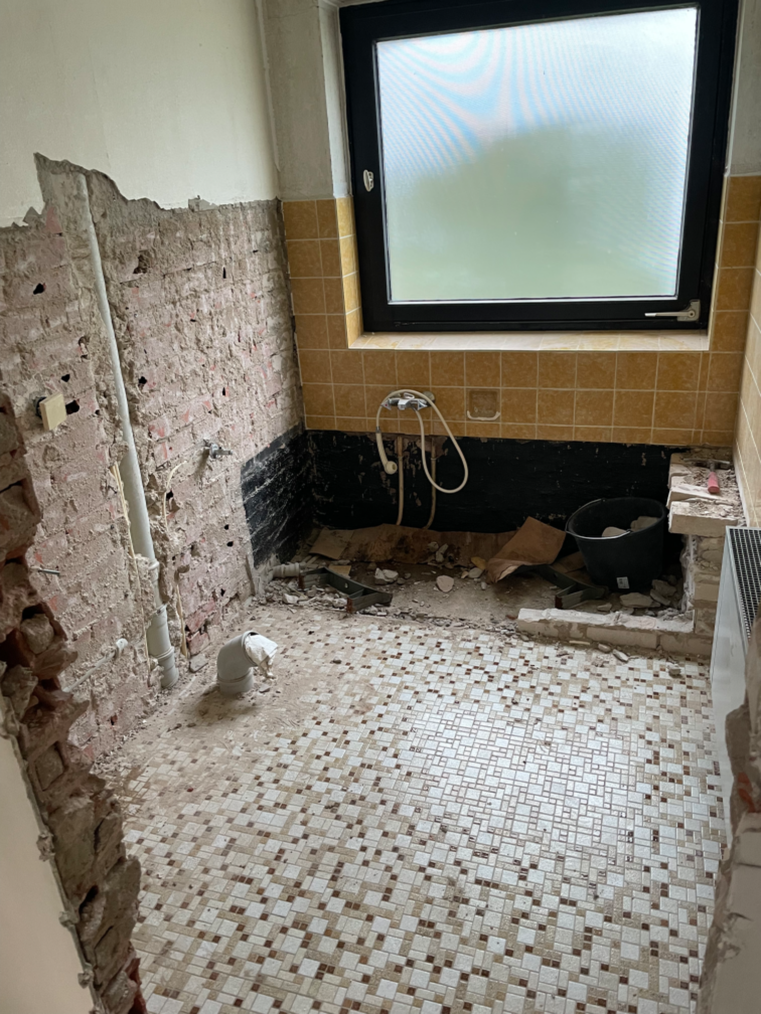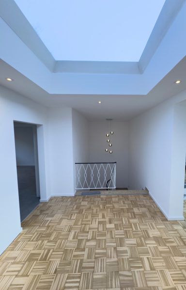 Parallel wurden die Arbeiten im Innenbereich des Hauses fortgeführt. Drei Bäder wurden saniert, samt aller Wasserleitungen. Die gesamte Elektrik im Haus wurde ab Zählerschrank neu installiert. Nachdem diese Arbeiten abgeschlossen waren, wurden die Innenwände verputzt, gespachtelt und gestrichen. Alle Bodenbeläge wurden nach Bemusterung des Bauherrn verlegt und zum Ende die neuen Innentüren eingebaut.